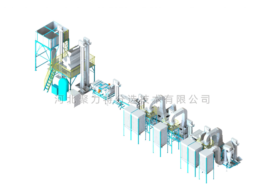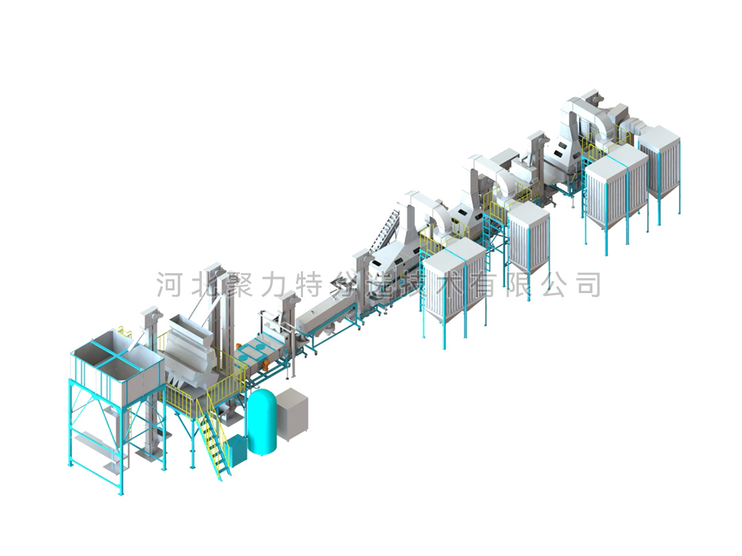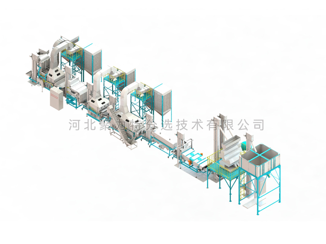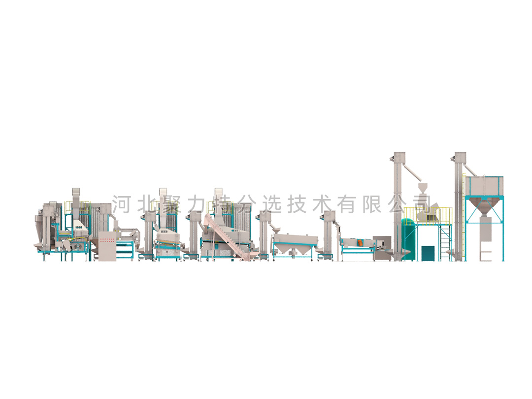 豆類清理生產(chǎn)線由風(fēng)篩清選機、磁力選土機、比重去石機、比重精選機、拋光機、振動分級篩、定量包裝秤、脈沖除塵器、布袋除塵器、提升機和其他輔件組成。