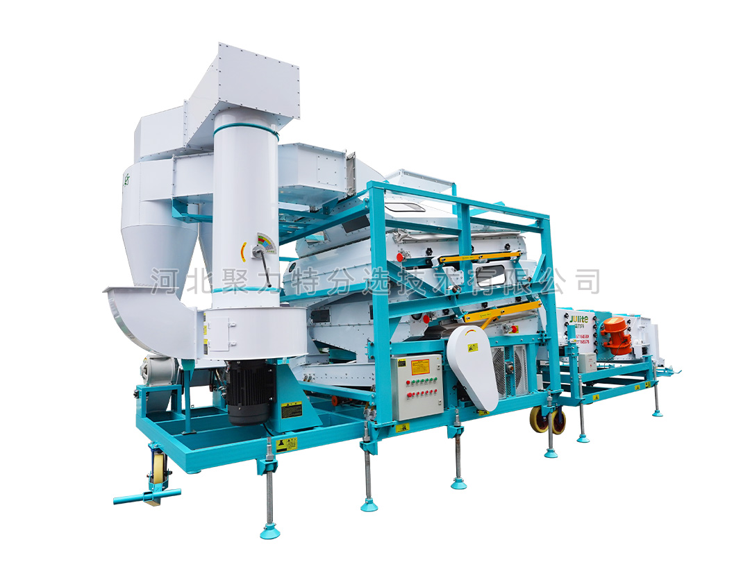 物料通過提升機(jī)經(jīng)喂入斗進(jìn)入第一道負(fù)壓比重臺(tái),通過風(fēng)選去除物料中的粉塵、糠殼等輕雜質(zhì),輕雜經(jīng)風(fēng)道、旋風(fēng)除塵器,由閉風(fēng)器排出;通過比重選有效去除物料中的秸稈、軸芯等比重較輕的雜質(zhì)。然后物料通過導(dǎo)糧機(jī)構(gòu)進(jìn)入第二道正壓比重臺(tái),通過調(diào)整風(fēng)量、擋板位置等進(jìn)行比重加工,去除物料中的碎粒、秕籽、芽粒、蟲蛀粒、霉變粒等雜質(zhì),比重后的物料,進(jìn)入雙篩箱振動(dòng)分級(jí)篩,雙篩箱同時(shí)加工,有效去除大雜、小雜、碎粒、瓣粒等雜質(zhì)。